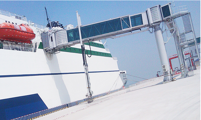 The main components of the L-shaped horizontally-shifting telescopic passenger boarding bridge are: joint building, rear door frame, side-by-shore telescopic road, front door frame, land side lifting mechanism, vertical bank expansion channel, sea side lifting mechanism, walking mechanism, and ship receiving Mouth, repair ladder, etc. Compared with other forms of boarding bridges, the L-shaped transverse boarding bridge has a wider range of activities and a wider adaptability, which can adapt to different parking positions. The traveling mechanism is an orbital overall traverse, driving the boarding bridge to achieve horizontal movement in parallel with the waiting ship building on the platform; 2 sets of lifting mechanism enable the boarding bridge to achieve height direction movement, so that the ship receiving port and the service The various cruise door doors are highly adaptable.Rotating telescopic boarding bridge