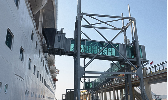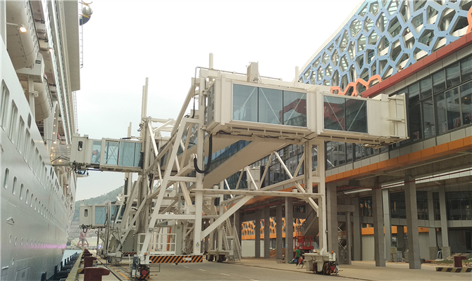 旋轉(zhuǎn)伸縮式登船橋是通過伸縮通道的旋轉(zhuǎn)和升降運動對接候船樓和郵輪的登船設(shè)備,此種登船橋采用中集天達(dá)自主研發(fā)的四輪驅(qū)動系統(tǒng)和控制系統(tǒng),能夠滿足登船碼頭惡劣的工況和完美對接不同型號的郵輪,同時活動渡板跟隨技術(shù)能夠補償郵輪隨潮汐變化的上下波動,接船服務(wù)范圍可覆蓋碼頭岸線約±30米,適應(yīng)垂岸距離較大的碼頭和各種噸位的客滾船/郵輪的對接。中集天達(dá)-旋轉(zhuǎn)伸縮式登船橋 -