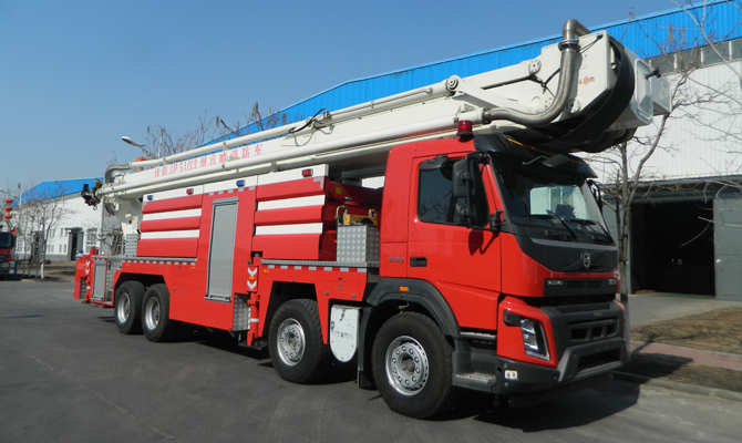 40m ladder fire truck, can achieve 360 degree full rotation straight ladder fire truck. Each performance mechanism adopts the electric control hydraulic drive, the operation is simple, the movement is flexible, the safety is reliable, the practicability is strong. Total 2 sets operating system: main operating console and manned platform. The ladder truck is equipped with advanced PLC computer automatic control system, which realizes the automatic deceleration and stop of the extreme position of each movement mechanism and ensures the safety of operation. The top of the ladder platform move with the ladder amplitude movement, automatic leveling lock, always maintain parallel with the ground. The platform is equipped with communication and water monitor fire extinguishing system, so that the ladder truck can work safely, stably and reliably in rescue operations. In addition, the vehicle is also equipped with a variety of fire fighting and rescue equipment fixed box and onboard equipment, so that the vehicle realized high altitude fire fighting, high altitude water tower and high altitude rescue function.40m ladder fire truck -